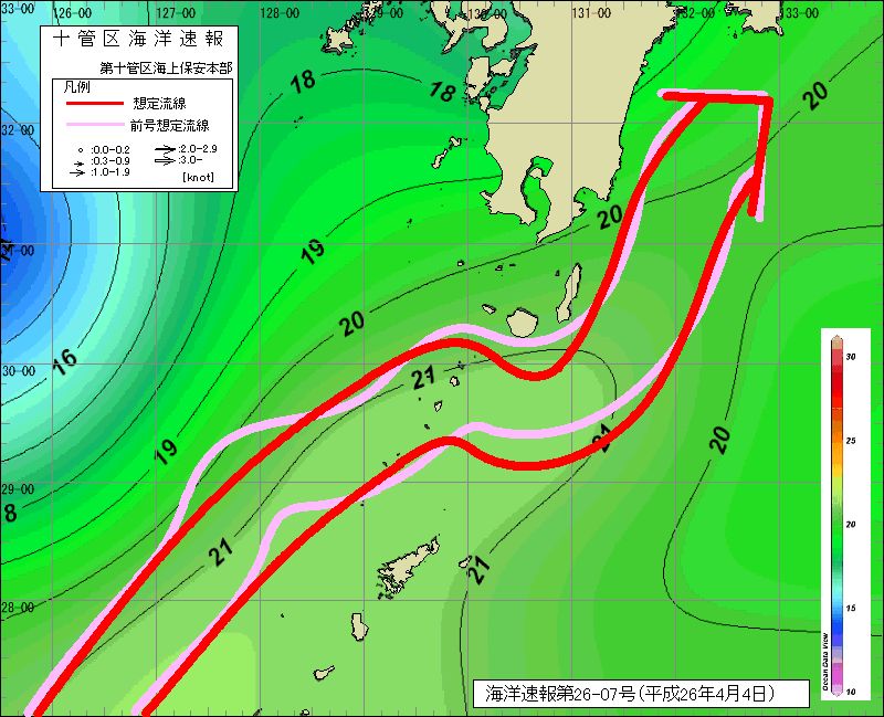 黒潮流軸付近の表面水温は19〜21℃台で前号と比較するとほぼ同温、沿岸海域は前号と比較すると-1℃〜同温となっている。