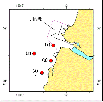 流速計が設置される。 期 間 令和8年1月29日〜2月14日(予備日15日〜28日) 位 置 4地点 (1) 31-50-44N 130-10-52E (2) 31-50-09N 130-09-13E (3) 31-49-37N 130-10-40E (4) 31-48-44N 130-09-53E 備 考 設置位置を灯付浮標(黄色、4秒1閃)、紅白旗及びレーダー反射器で表示 海 図 W1254−W206−W207 出 所 串木野海上保安部
