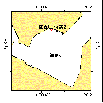 鋼管杭が設置された。 位置1 2地点を結ぶ線上 (1) 32-26-30.1N 131-38-52.1E (2) 32-26-30.8N 131-38-52.9E 位置2 2地点を結ぶ線上 (3) 32-26-29.6N 131-38-52.8E (4) 32-26-30.5N 131-38-53.8E 備 考 上記(1)(3)(4)位置に黄色灯が設置されている 海 図 W1223 出 所 十本部海洋情報部