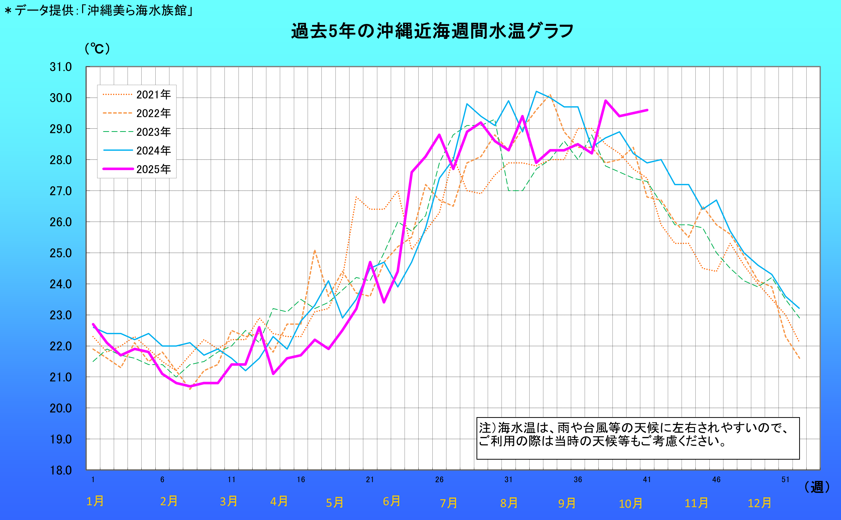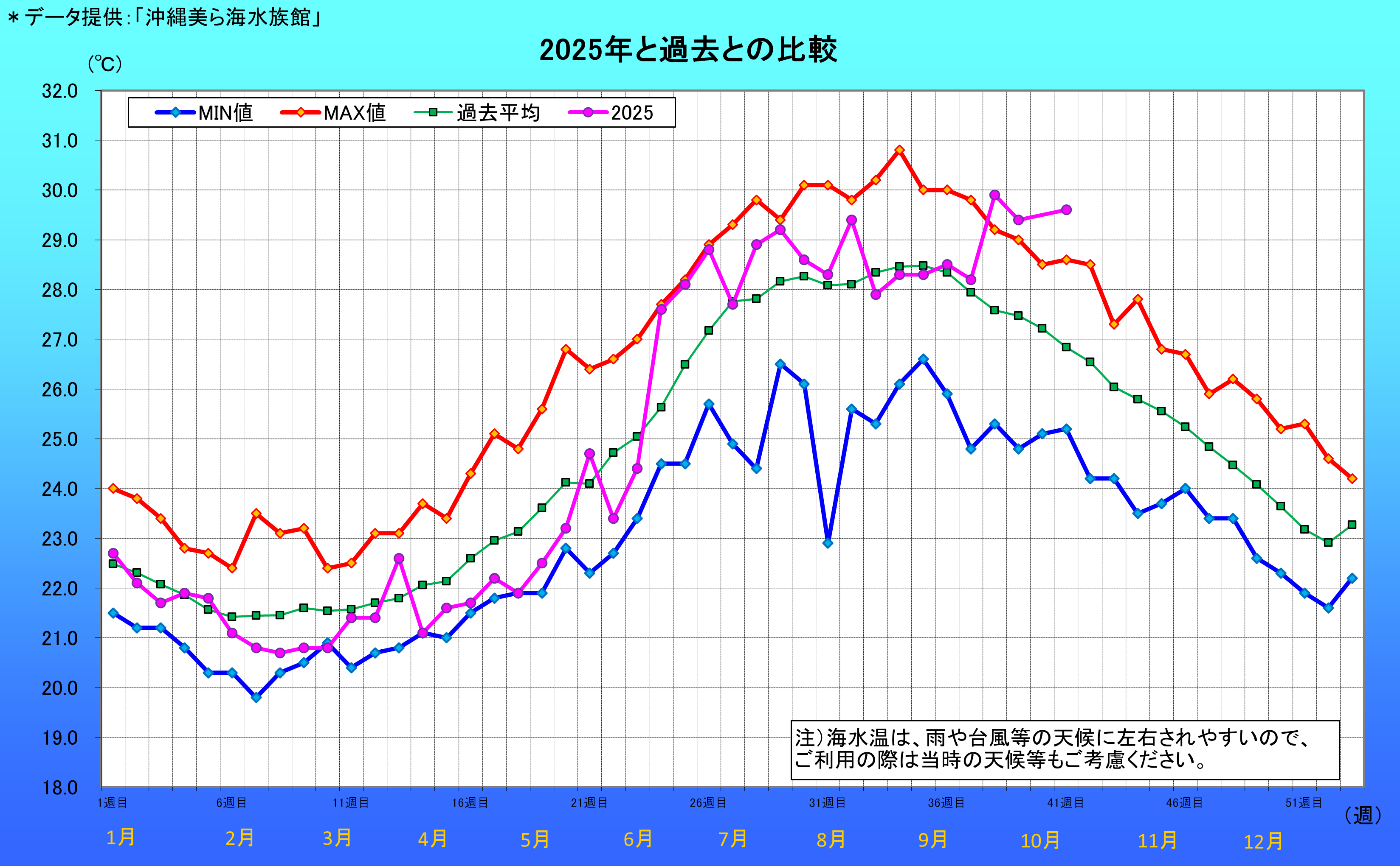 「沖縄美ら海水族館」の御協力を得て、毎週金曜日の午前10時頃に同水族館沖合300m地点の水深20mからポンプにて採取し、 配水管を通じ水槽に入る直前の海水温を取りまとめています。