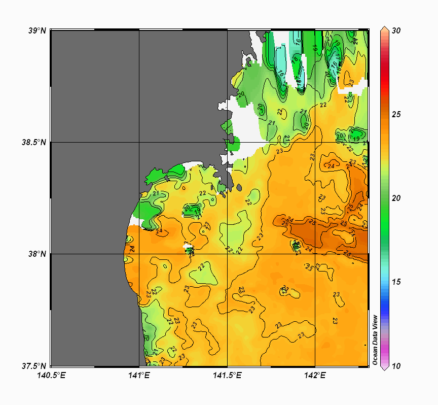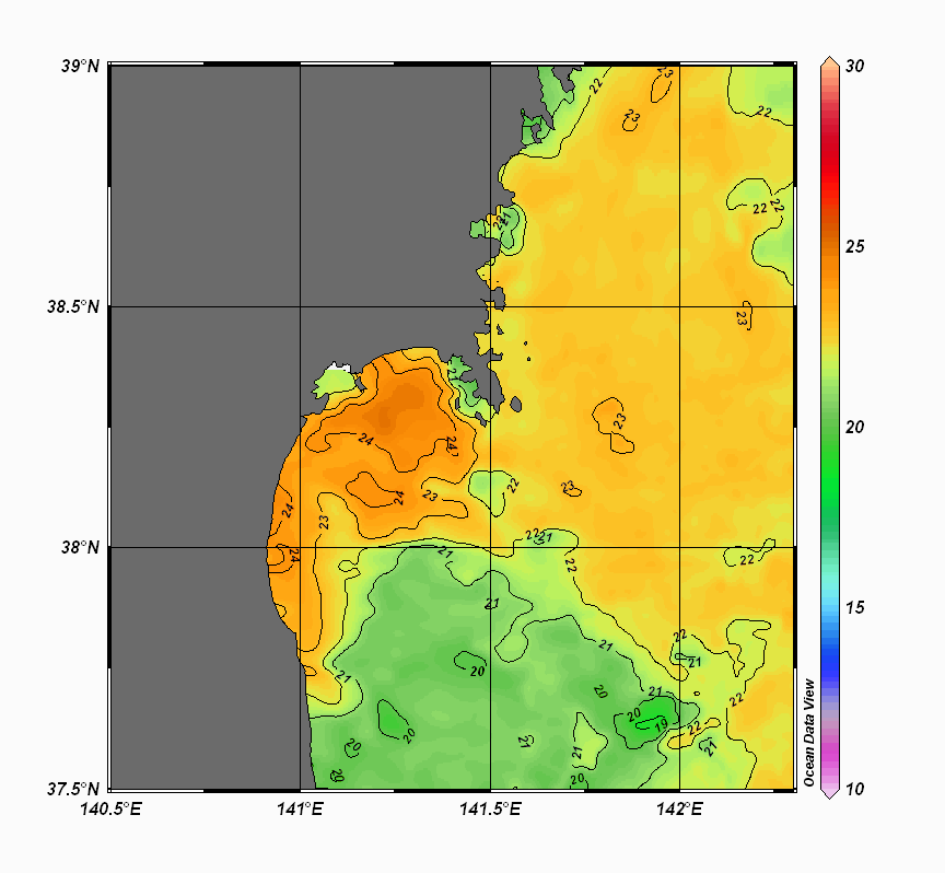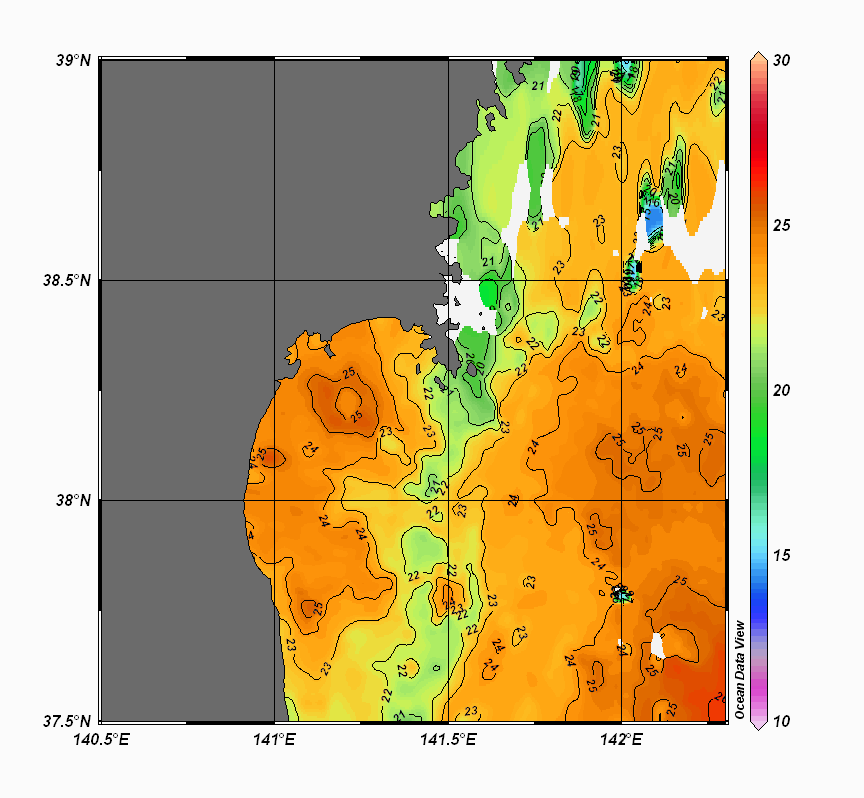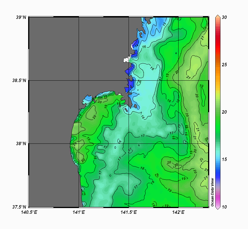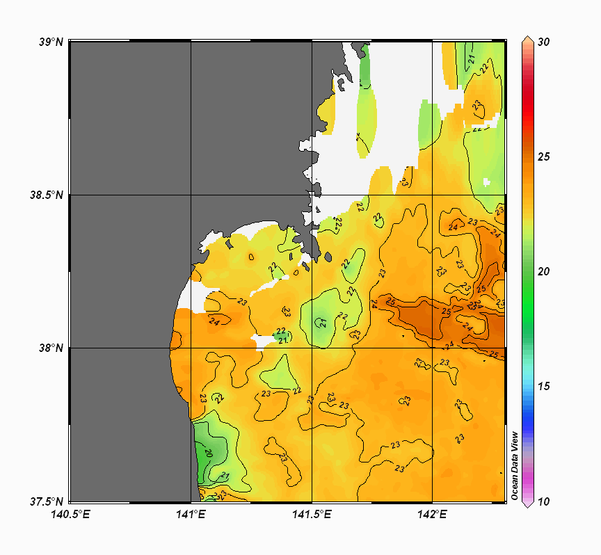 2008年4月から2025年8月までの、仙台湾付近表面水温を掲載しています。