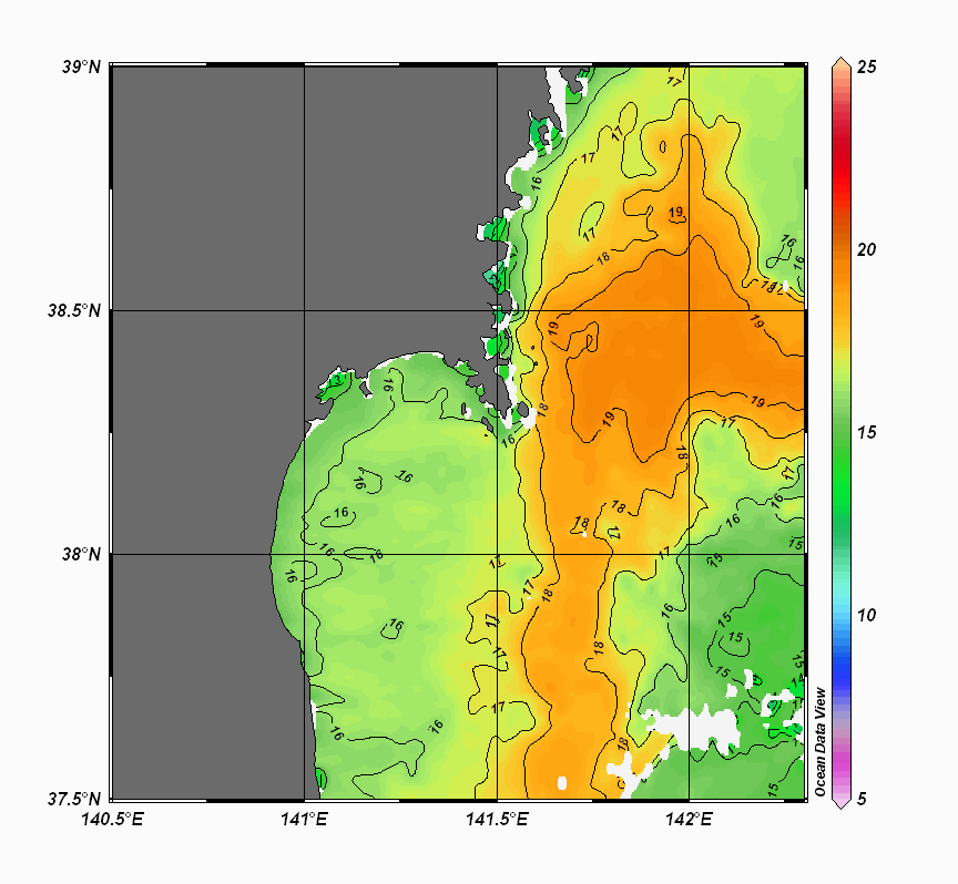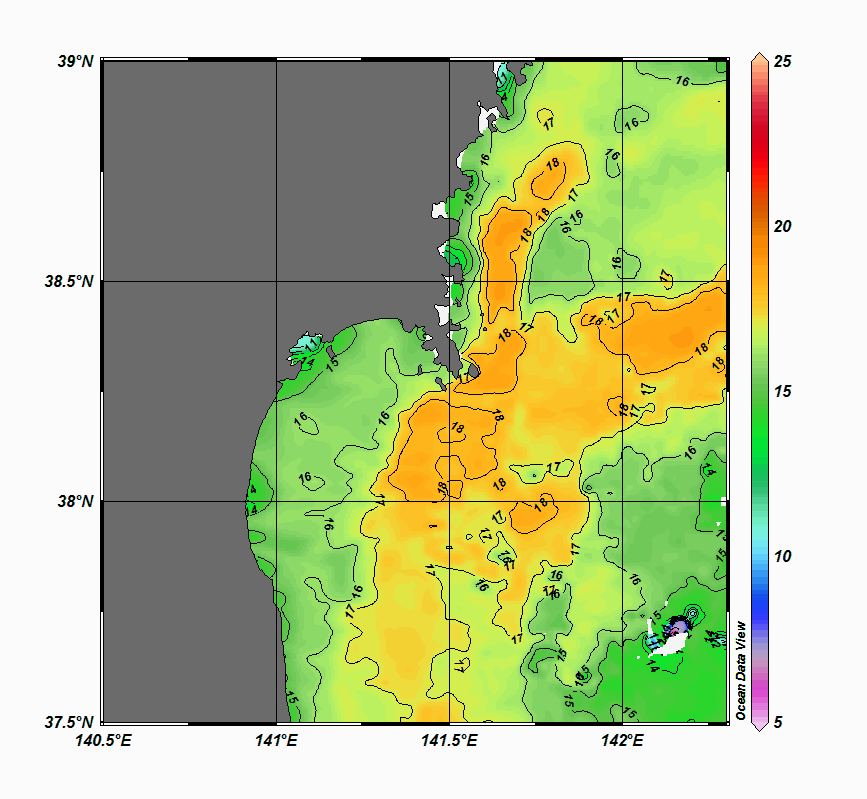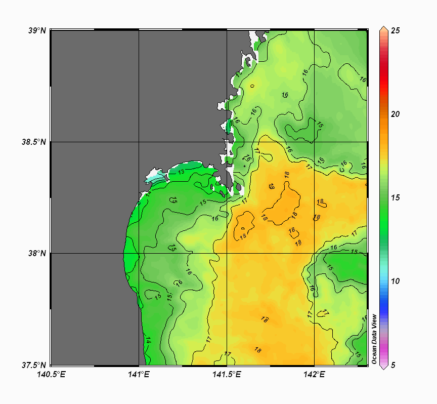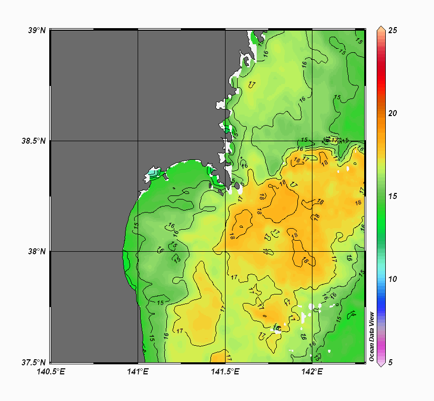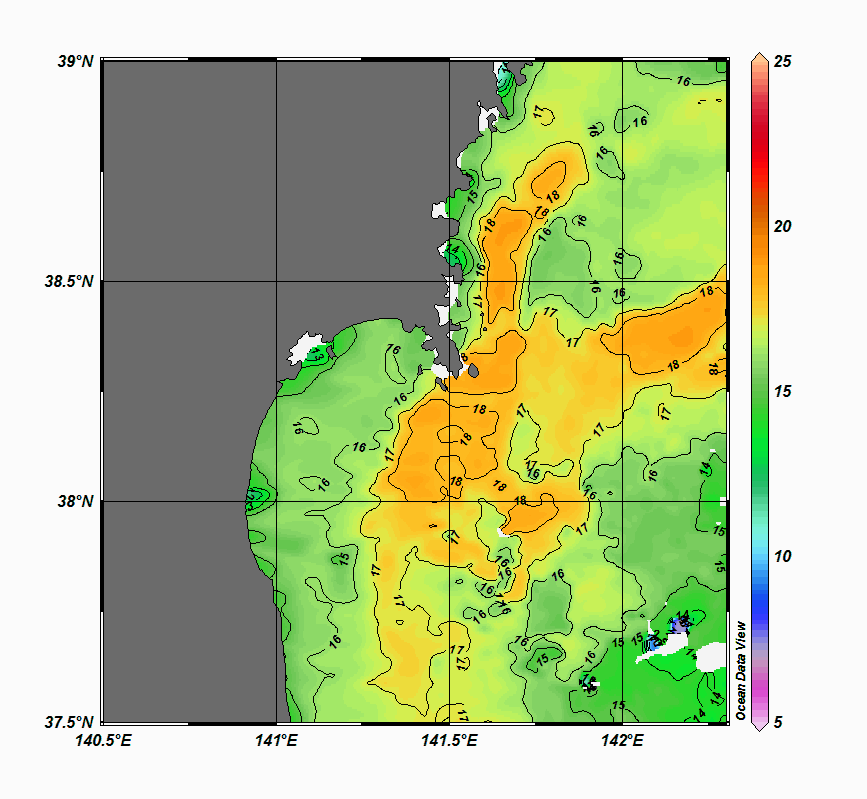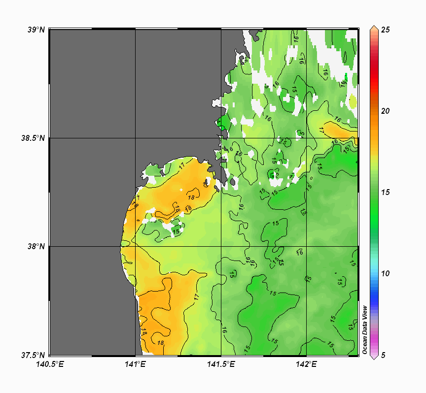 2008年4月から2025年8月までの、仙台湾付近表面水温を掲載しています。