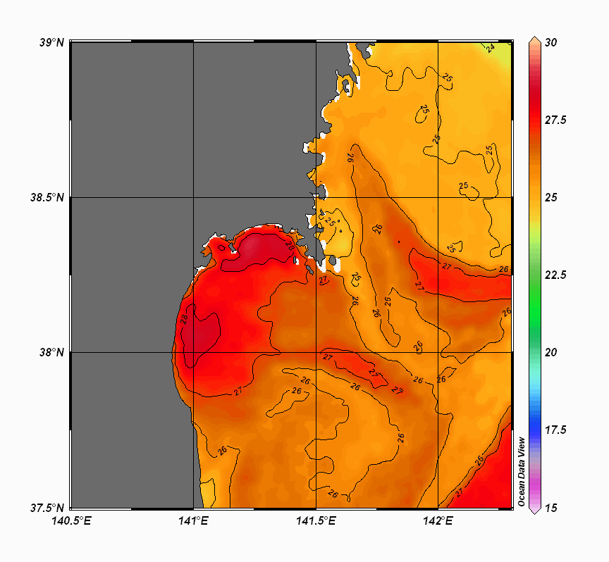 2008年4月から2025年8月までの、仙台湾付近表面水温を掲載しています。