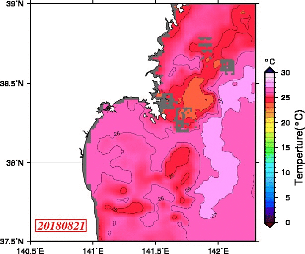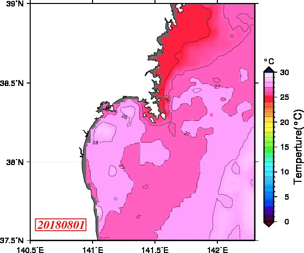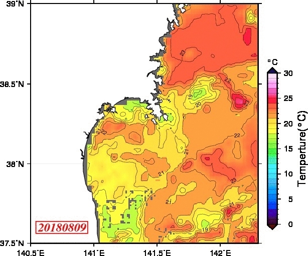 2008年4月から2025年8月までの、仙台湾付近表面水温を掲載しています。