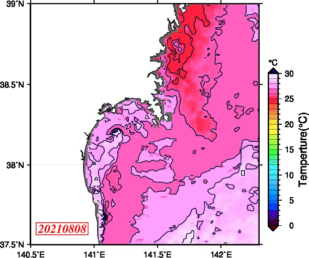 2008年4月から2025年8月までの、仙台湾付近表面水温を掲載しています。