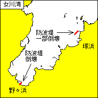 1.防波堤一部倒壊 区 域 下記2地点を結ぶ線上 (1) 38-24-34.2N 141-29-25.9E (2) 38-24-31.2N 141-29-22.8E2.防波堤倒壊 区 域 下記2地点を結ぶ線上 (3) 38-23-39.6N 141-28-11.2E (4) 38-23-41.5N 141-28-12.7E 海 図 W1095 出 所 二本部海洋情報部