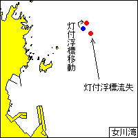 1.下記位置の灯付浮標は、流失している。 位 置 38-24-47N 141-30-48E 備 考 仮灯(単閃緑光 毎4秒に1閃光)設置 2.下記のとおり灯付浮標は、移動している。 位 置 (移動前) 38-24-48N 141-30-45E (移動後) 38-24-50N 141-30-46E 海 図 W1095−W1410 出 所 宮城海上保安部