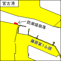 区 域 下記2地点を結ぶ線上付近 (1) 39-38-20.0N 141-57-47.5E (2) 39-38-19.5N 141-57-49.3E 備 考 高さ3.5m、厚さ4mの防潮堤が崩落している 海 図 W1405 出 所 宮古海上保安署