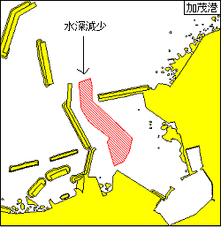 下記12地点により囲まれる区域の水深は、図載水深より約0.5〜2m減少している。