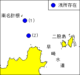 位 置 (1) 38-24-43.3N 141-31-52.2E 水深約 15m (2) 38-24-23.2N 141-31-58.4E 水深約 14.2m 海 図 W1095 出 所 二本部海洋情報部