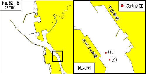 位 置 (1) 39-44-48.7N 140-03-47.0E 水深約 7.1m (2) 39-44-46.4N 140-03-48.6E 水深約 3.7m 海 図 W148 出 所 二本部海洋情報部
