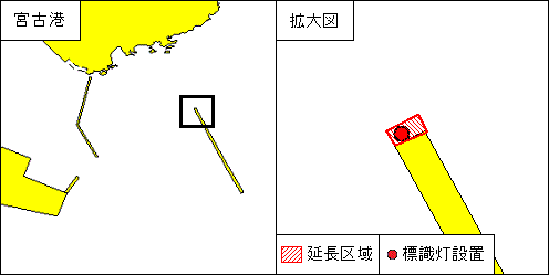 1 防波堤延長 区 域 下記2地点を結ぶ線上(幅 約10m) (1) 39-38-30.6N 141-58-49.4E (2) 39-38-30.5N 141-58-49.5E(防波堤先端) 2 標識灯設置 位 置 (3) 39-38-30.5N 141-58-49.4E 備 考 上記(3)位置に黄色標識灯(毎4秒に1閃光)を設置 海 図 W1405 出 所 二本部海洋情報部、釜石海上保安部