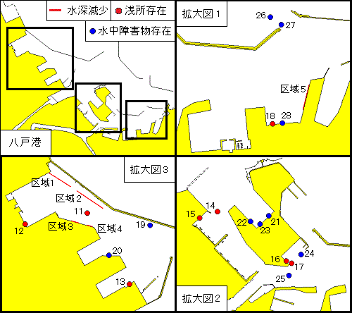 2024年92項 本州東岸 − 八戸港、第1区、第2区及び第3区 水深減少、浅所及び水中障害物存在 二管区水路通報4年4号49項削除(同項区域3の水深変更)