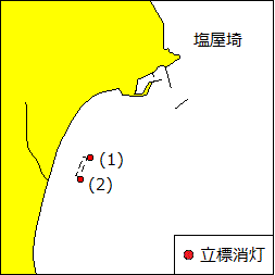 位 置 下記各地点 (1) 36-59-11N 140-58-22E (2) 36-59-04N 140-58-18E 備 考 上記位置の黄色灯付立標2基は消灯している。 海 図 W68 出 所 福島海上保安部