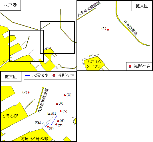 2024年251項 本州東岸 − 八戸港、第3区 浅所存在及び水深減少 二管区水路通報5年10号118項削除(同項の位置(5)及び区域1削除)