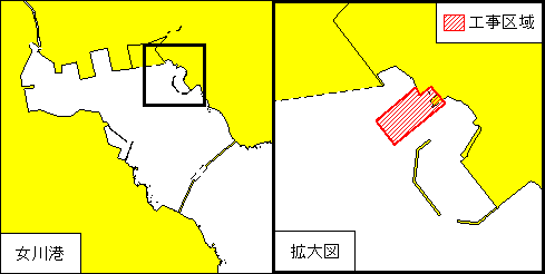二管区水路通報7年25号390項削除(同項の期間延長) 期 間 令和8年3月15日まで、日出〜日没 区 域 下記4地点を結ぶ線及び陸岸により囲まれる区域 (1) 38-26-40N 141-27-43E (2) 38-26-38N 141-27-39E (3) 38-26-39N 141-27-38E (4) 38-26-41N 141-27-41E 備 考 起重機船を使用 潜水作業を伴う 汚濁防止膜を設置 海 図 W1095(分図「女川港」) 出 所 石巻海上保安署