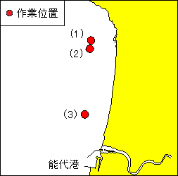 期 間 令和7年12月1日〜令和8年1月31日、日出〜日没 位 置 下記各地点 (1) 40-20-26N 139-59-19E (2) 40-19-53N 139-59-13E (3) 40-15-32N 139-58-47E 備 考 上記位置に観測機器を示す赤白旗、レーダー反射板及び黄色灯付浮標(毎4秒に1閃光)を設置 停船して観測機器を垂下する 海 図 W1195 出 所 秋田海上保安部