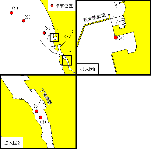 期 間 令和8年2月13日〜28日、日出〜日没 区 域 下記各地点 (1) 39-49-34.9N 139-56-38.7E (2) 39-48-47.3N 139-58-12.3E (3) 39-47-35.0N 140-00-51.7E (4) 39-47-07.0N 140-02-05.3E (5) 39-44-47.3N 140-03-48.3E (6) 39-44-42.4N 140-03-52.5E 海 図 W148−W1192 出 所 秋田海上保安部