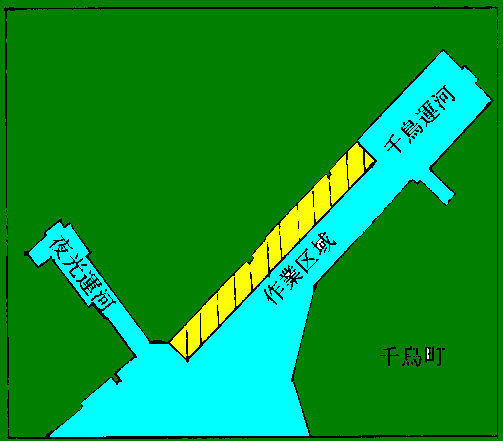 千鳥運河の日本石油化学前面において、掘り下げ作業が実施される。 期間 9月1日〜12月5日 昼間のみ 区域 付図に示す海面 海図 67 出所 京浜港長