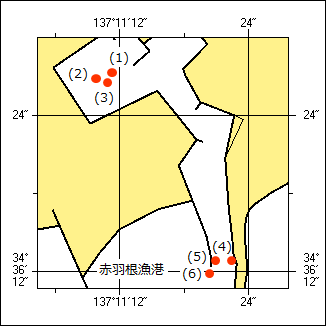 7年367項 本州南岸 − 遠州灘、赤羽根漁港 浅所存在 赤羽根漁港において、浅所が存在する。 位 置 下記6地点付近 (1) 34-36-27.3N 137-11-11.3E (約1.1m) (2) 34-36-26.8N 137-11-09.8E (約1.3m) (3) 34-36-26.6N 137-11-10.8E (約1.0m) (4) 34-36-13.0N 137-11-22.5E (約1.1m) (5) 34-36-12.9N 137-11-20.7E (約0.7m) (6) 34-36-12.0N 137-11-20.3E (約1.2m) 海 図 W1024(赤羽根漁港) 出 所 第四管区海上保安本部![]()