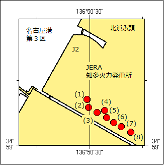 7年374項 名古屋港 − 第3区 タンク不存在 下記位置のタンク8基は不存在である。 位 置 (1) 34-59-10.4N 136-50-29.2E (2) 34-59-08.9N 136-50-29.5E (3) 34-59-07.5N 136-50-32.0E (4) 34-59-08.0N 136-50-34.2E (5) 34-59-06.4N 136-50-34.7E (6) 34-59-05.1N 136-50-36.8E (7) 34-59-04.2N 136-50-38.9E (8) 34-59-02.9N 136-50-41.6E 海 図 W1055A 出 所 第四管区海上保安本部![]()