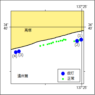 7年401項 本州南岸 − 遠州灘 標識灯消灯等 (四管区水路通報7年373項 削除) 高塚地先の潜堤明示用の標識灯は、4基が仮灯となっている。 復旧予定 未定 位 置 下記4地点付近 (1) 34-39-18N 137-24-50E(仮灯)(豊橋海岸沖A立標) (2) 34-39-14N 137-24-30E(仮灯)(豊橋海岸沖C立標) (3) 34-38-38N 137-20-40E(仮灯)(田原豊橋海岸沖A立標) (4) 34-38-35N 137-20-27E(仮灯)(田原豊橋海岸沖B立標) 備 考 仮灯:黄色、4秒に1せん光 海 図 W1052、W70 出 所 鳥羽海上保安部![]()