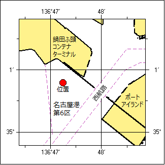 7年418項 名古屋港 − 第6区 観測機器設置等 鍋田ふ頭コンテナターミナル南方において、観測機器が設置される。 期 間 令和7年9月29日〜令和8年3月16日(予備日 3月17日〜3月31日) 位 置 35-00-48N 136-47-14E 付近 備 考 期間中、作業船による設置、点検及び揚収作業が実施される。 潜水作業中は国際信号旗「A」旗が掲揚される。 観測機器の位置を示す標識灯及び旗が設置される。 海 図 W1055A 出 所 名古屋港長