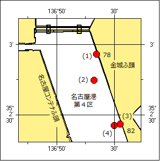 7年442項 名古屋港 − 第4区 浅所存在 金城ふ頭77号及び82号岸壁等において、浅所が存在する。 位 置 下記4地点付近 (1) 35-02-56.0N 136-50-20.8E (約 8.9m) (2) 35-02-44.8N 136-50-19.4E (約12.4m) (3) 35-02-26.1N 136-50-33.1E (約 8.6m) (4) 35-02-25.5N 136-50-30.0E (約12.8m) 海 図 W1055A 出 所 第四管区海上保安本部