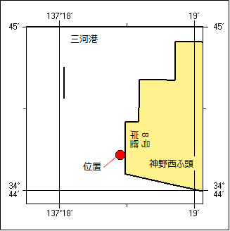 7年580項 本州南岸 − 三河港南部 灯付浮標不存在 神野西ふ頭8号岸壁の泊地明示用の黄色灯付浮標は不存在となっている。 復旧予定 未定 位 置 34-44-13N 137-18-27E 付近 海 図 W1057A、W1057B 出 所 名古屋海上保安部