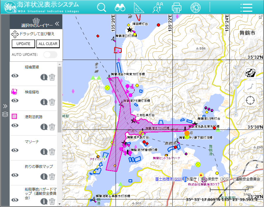 海しる版マリンハザードマップは、船舶事故の多くの割合を占める小型船に対して、事故防止啓発用に作成した海しる(海洋状況表示システム)のテーマ別マップです。 過去の船舶事故や定置網の位置などの情報を掲載しています。 船舶の運航には、最新の情報に更新された海図を使用してください。