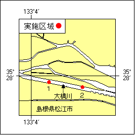 八管区水路通報7年34号423項関連 松江港の大橋川において、台船(長さ30m、幅12m)が設置され、堀下げ作業等が実施される。 期 間 令和7年10月15日〜令和8年1月31日 日出〜日没 区 域 下記2地点付近 (1) 35-27-55N 133-04-17E (2) 35-27-51N 133-04-50E 備 考 潜水作業を伴う(国際信号旗「A旗」掲揚) 汚濁防止フェンス設置 夜間停泊時はアンカー及び汚濁防止フェンスに灯付浮標設置 警戒船配備 海 図 W1174 出 所 境海上保安部