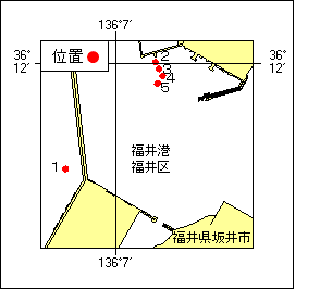 福井港福井区の下記地点に浅所が存在している。 位 置 下記5地点 (1) 36-11-39.1N 136-06-45.7E 水深約6.5m (2) 36-12-00.3N 136-07-10.9E 水深約3.5m (3) 36-11-58.8N 136-07-11.9E 水深約3.4m (4) 36-11-57.2N 136-07-12.9E 水深約4.0m (5) 36-11-55.5N 136-07-11.5E 水深約6.2m 海 図 W1184 出 所 八本部海洋情報部