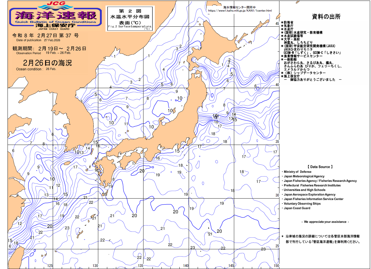 海洋情報部トップ >海洋速報&海流推測図 >海洋速報(水温水平分布図)