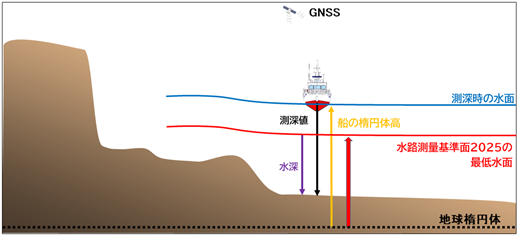 水準測量基準面2025は、地球楕円体からの高さで最低水面を定めています。地球楕円体からの高さは大地震による地盤変動や津波等などの物理的な破壊や変動の影響を受けないため、災害後でも引き続き精度の高い水深測量をすることができます。