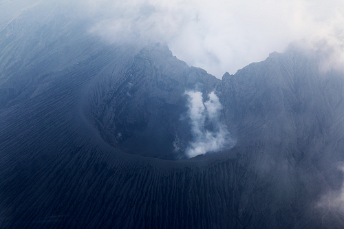 写真中央の南岳火口及び昭和火口から噴煙が立ち上っている。写真左上部には、北岳が見える